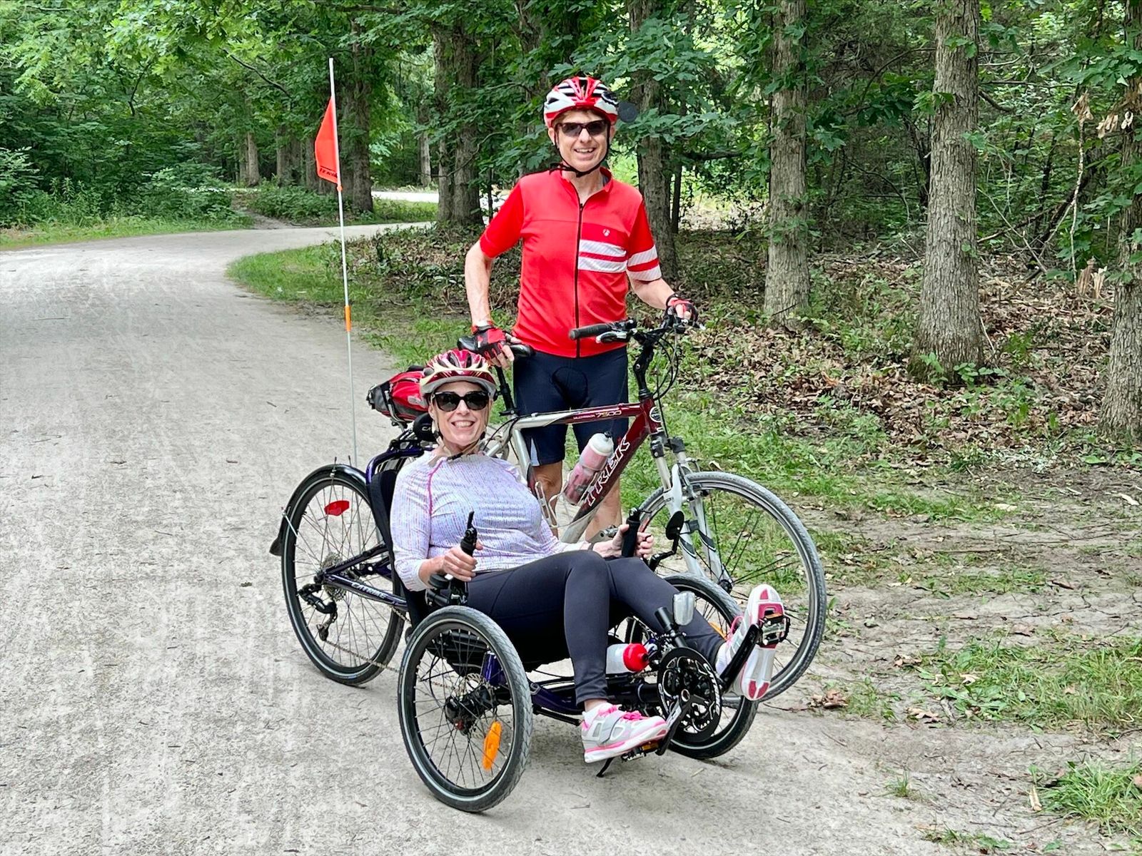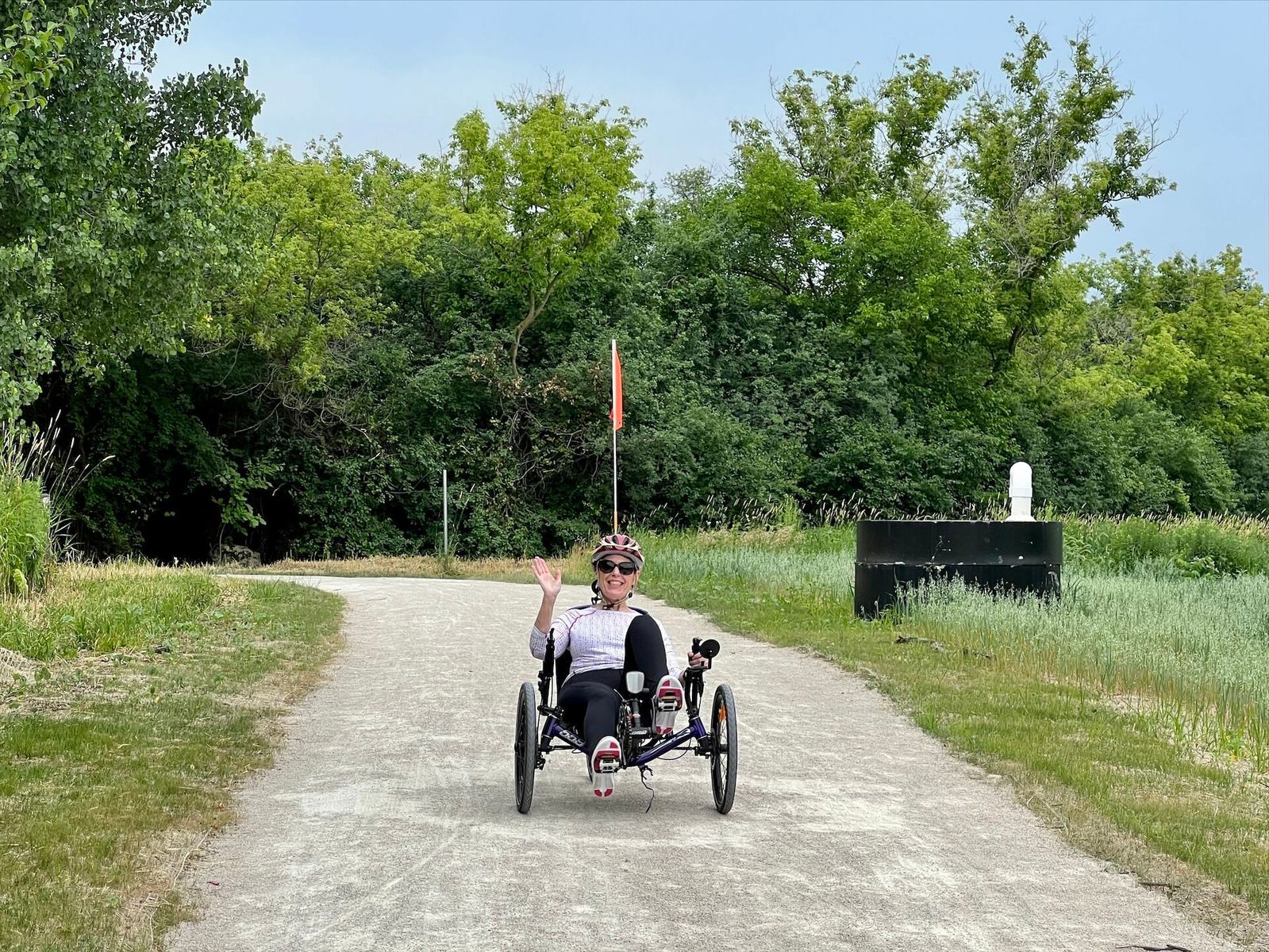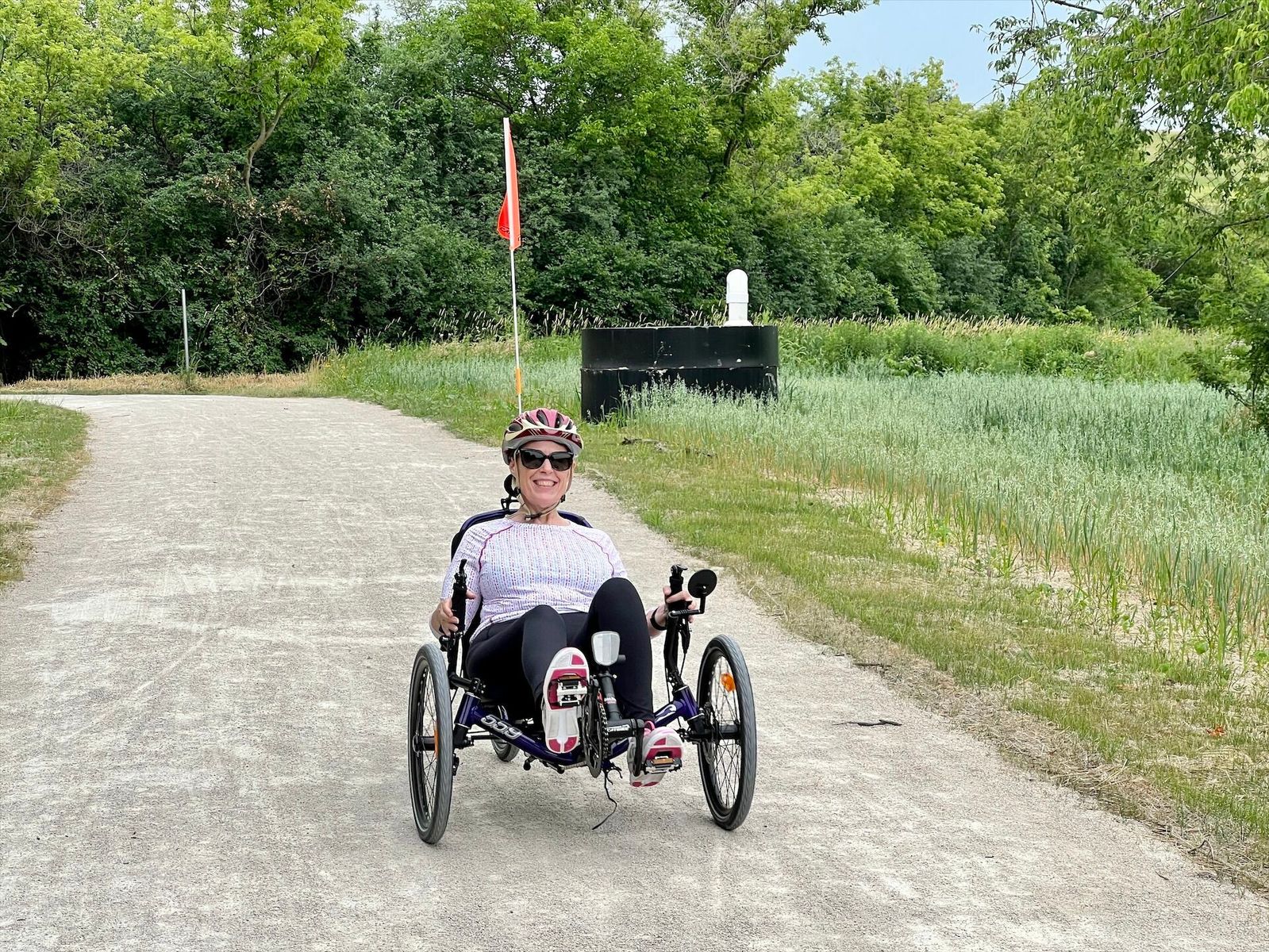 I accompanied Tammy on her first trike ride to the Mallard Lake Trail, the Greenbrook School grounds, and back home. We started at 12:45 and returned home at 1:50 p.m. Skies were cloudy and sprinkles started as we re-entered our subdivision. The temperature was about 70 with light S winds.
