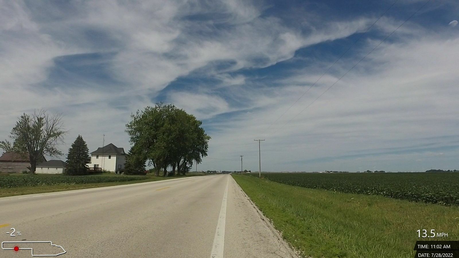 D'Emonda. Partly cloudy, warm but comfortable, somewhat humid, strong West/WNW winds @ 10-12 mph. Good strong workout, good time and power on the out leg, finally some good speed work on the return leg. Actual distance was closer to 43.5 but had to walk/hobble through a long section of chunky gravel on Harter Rd from County Line to the first curve.
